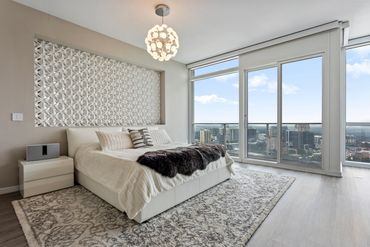 High above Midtown Atlanta, a client purchased two side-by-side, two-story penthouse units, each about 3,000 sq ft. Originally, they were builder-grade rental apartments: transitional interiors with aged wood floors, shaker cabinets, and travertine tile in the bathrooms.