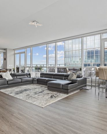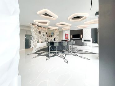 Over several years and two major phases, GoToPros transformed and combined these tired units into a single, 6,000 sq ft modern penthouse: a calm, white, gallery-like home with one-of-a-kind custom moments—most notably a dramatic, story-driven bar at its heart.